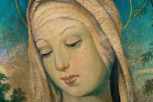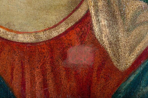 The canvas probably shortened and heavily restored, has numerous gaps and color losses. The painter certainly studied "high" models such as Pinturicchio's Madonna della Pace today preserved in San Severino Marche, without however approaching the peaks reached by the Master.