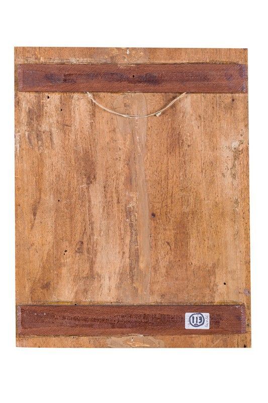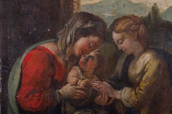 The tablet takes up the iconography of the famous mystical Marriage by Correggio, now preserved in the Capodimonte Museum. The work, also painted on a small panel, was requested at the end of the 16th century by Odoardo farnese for his Roman collection and we know that already in the middle of the 17th century several copies were circulating.