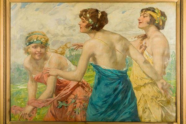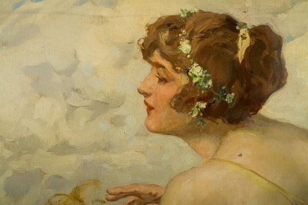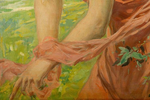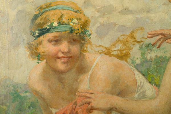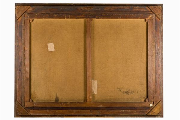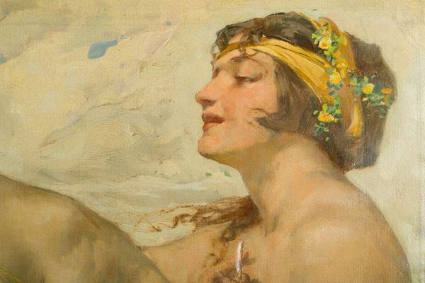 The canvas, which shows the influence of Alma Tadema in the composition, has two cuts, restored by patching on the reverse and repainting at the laceration, and a small hole.
