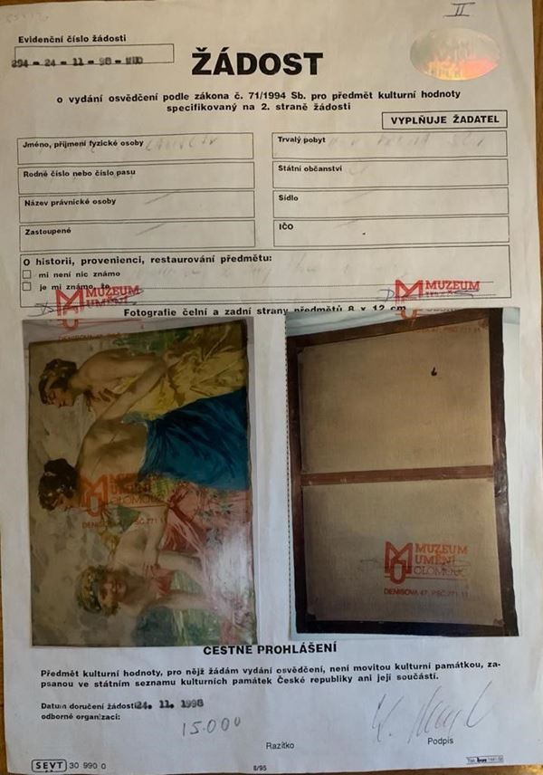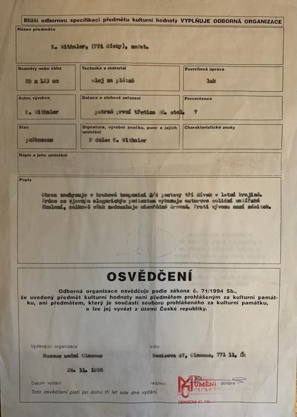 The work is accompanied by a certificate of guarantee from the Museum Rumeni Olomouc, which attributes the work to K. Withaler. Framed
