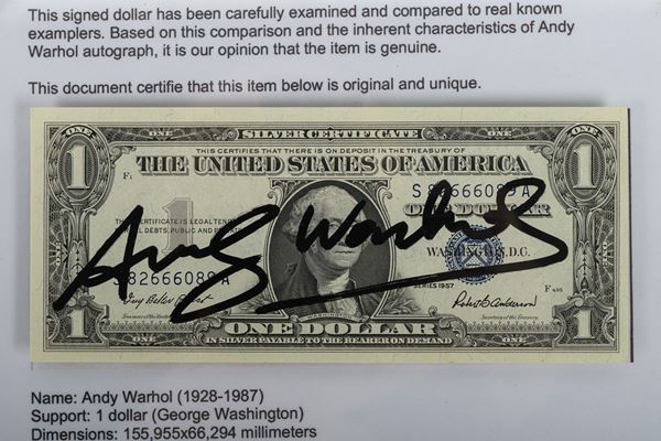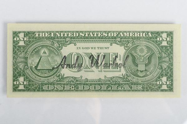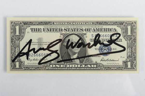 The front of the banknote features Andy Warhol's signature in black marker in the center. The artist's stamp is visible on the reverse.