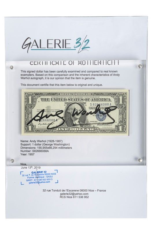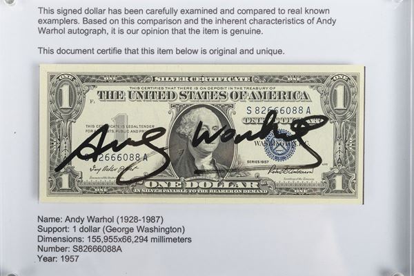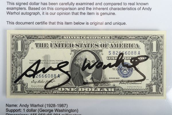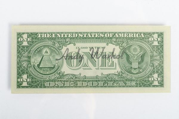 The front of the banknote features Andy Warhol's signature in black marker in the center. The artist's stamp is visible on the reverse.