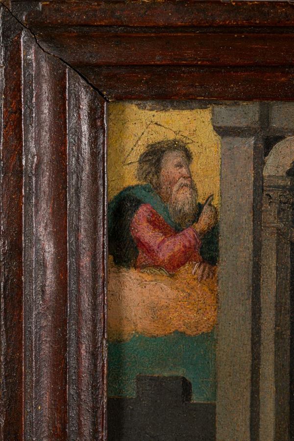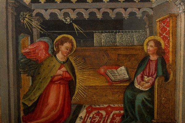 The tablet is inspired by the famous "miraculous fresco" of the Annunciation executed in the mid-fourteenth century for the church of the Santissima Annunziata in Florence. This peculiar iconography made famous by the copy that Alessandro or Cristofano Allori made at the end of the sixteenth century, was then replicated in the following centuries in numerous copies.