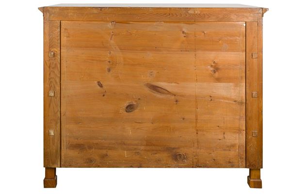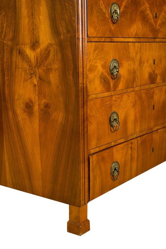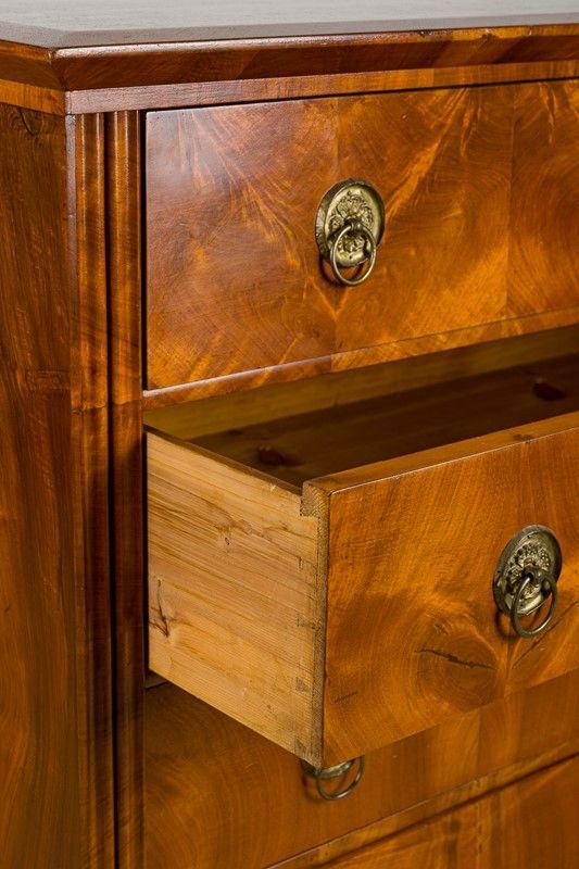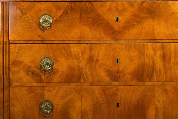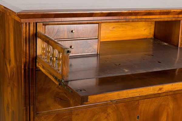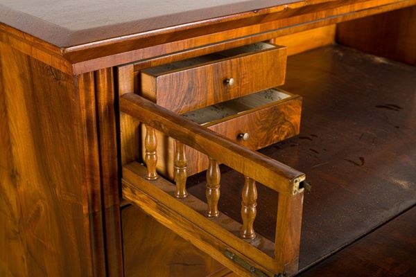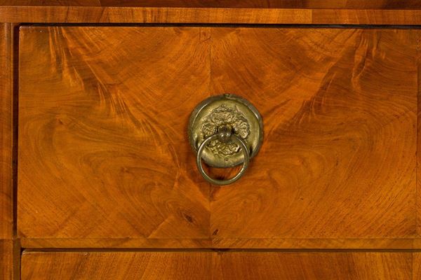 in briar walnut, with four drawers, first flap drawer with compartment and four drawers, bronze applications
