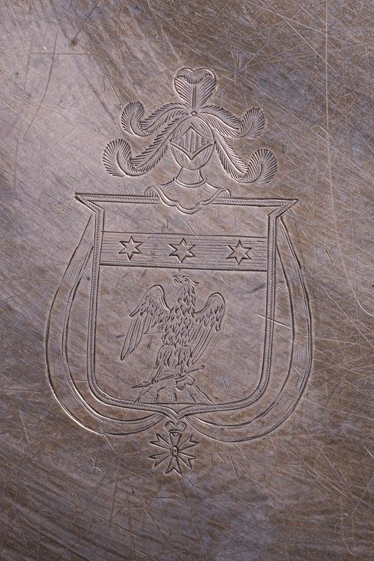 shaped edge, heraldic emblem engraved in the center and date engraved on the bottom, weight: gr. 1046