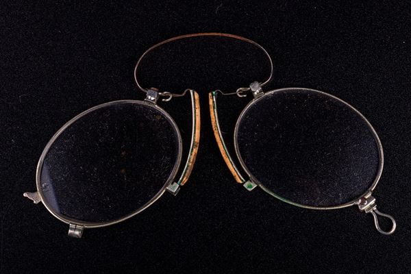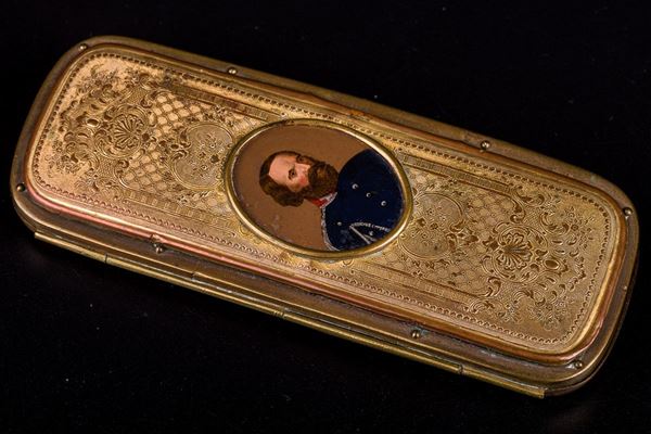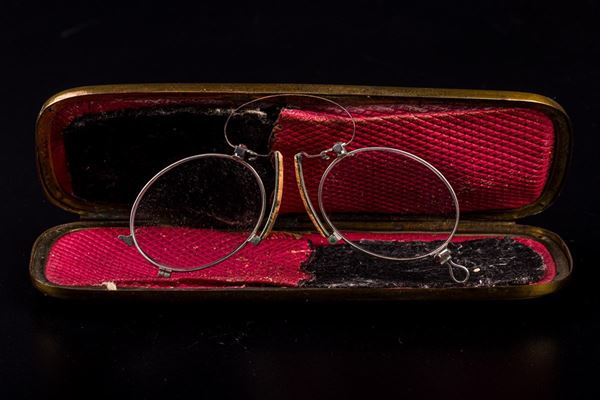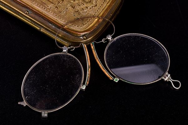 The glasses holder, of Italian manufacture, in chiseled gilded metal, still preserves the glasses inside. It features a miniature depicting a male figure in uniform, painted on leather