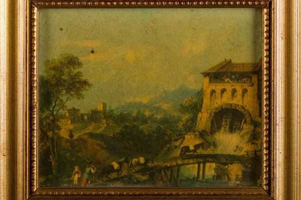 Pair of landscapes with genre scenes in the style of the seventeenth century, painter of the twentieth century