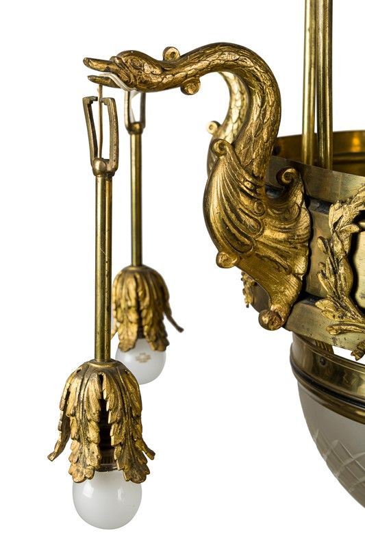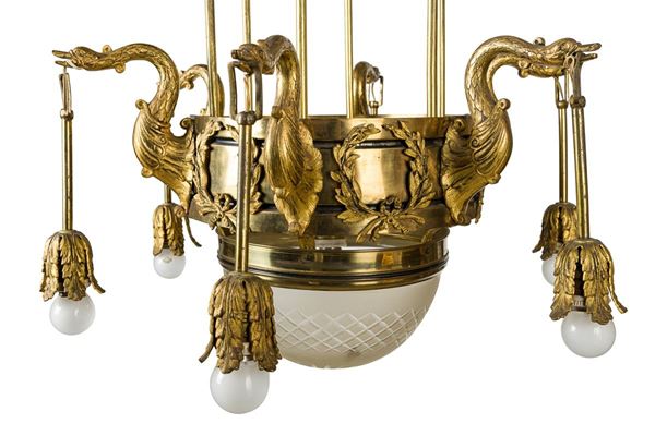 arms in the shape of a swan's head holding six lights plus two lights in the central body, in gilded metal, bronze and glass