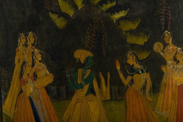 large Hindu devotional canvas, intended to decorate the walls of temples, depicting Gopi dancing at the temple and Krsna. Framed