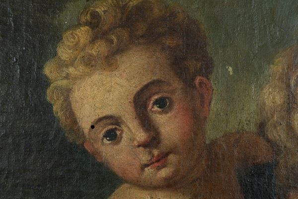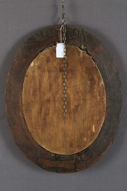 oil painting on canvas glued on oval-shaped board, within a carved and gilded coeval wooden frame.