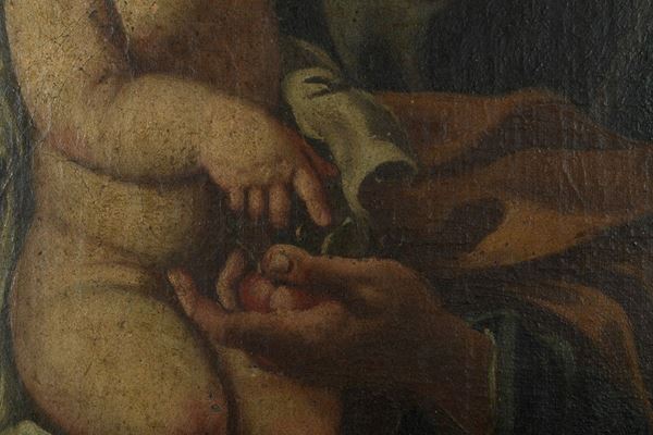 The small canvas depicts St. Joseph holding up the seated Child, on a red velvet cushion wrapped in a flap of white fabric. The child affectionately embraces his father and with his right hand points to the fruit in his hand. According to traditional iconography, St. Joseph wears a dark robe with a yellow ocher cloak and on his shoulder he carries a flowering rod, an attribute that immediately identifies him and refers to the miracle of the flowering of the dry branch, which made him choose as Mary's husband.