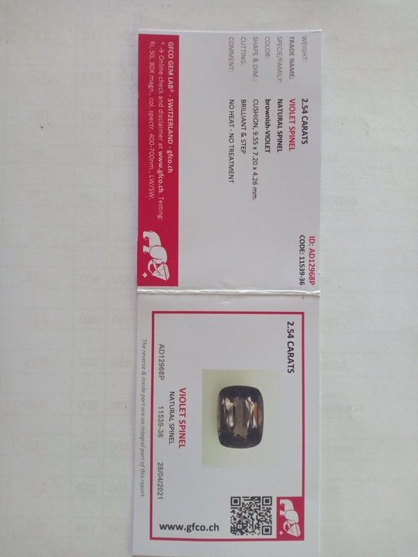 Provenance: Mogok Mines - Burma (Myanmar) - 2.54 carats - color: violet / brown - shape: cushion - measurements: 9.55 x 7.20 x 4.26 mm - cut: brilliant &  step - untreated - not heat treated - with certificate GFCO (Swiss laboratory) AD12968P
