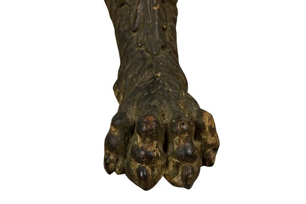 trunk with carved female figure, tripartite foot in feral paws, serious breakages and defects