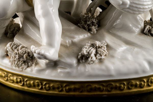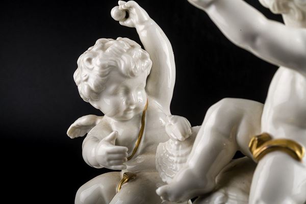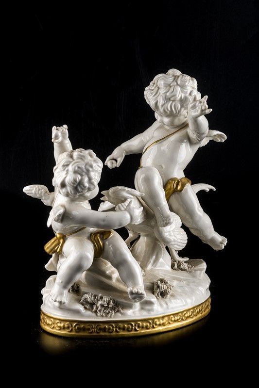 Ginori Capodimonte manufacture. Pair of putti in bacchanal with mythological bird.