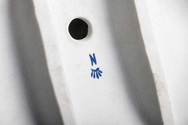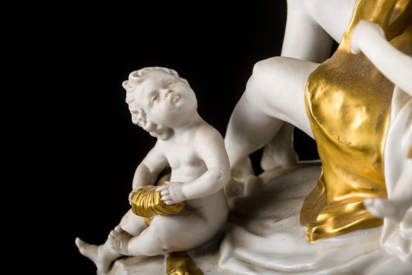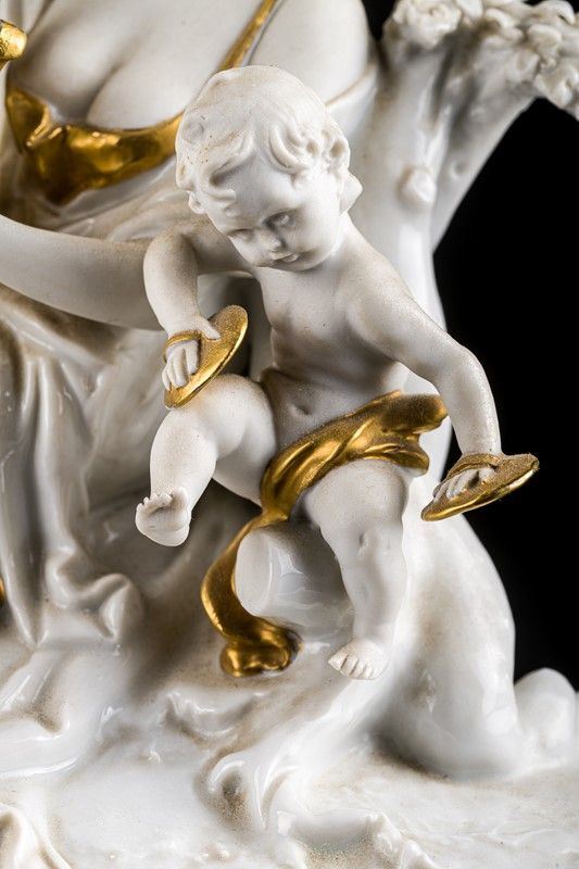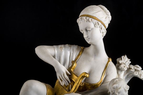depicting a female figure with lyre and musician cherubs, marked "N" crowned at the base