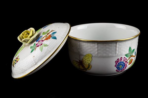 Elegant hand-painted sugar bowl with floral decorations and a small rose for the lid knob. Small lack on the rose in relief.