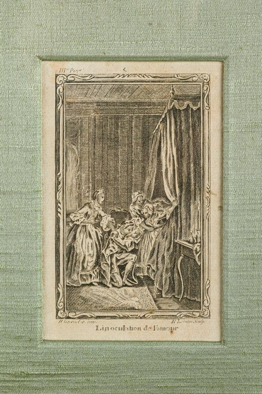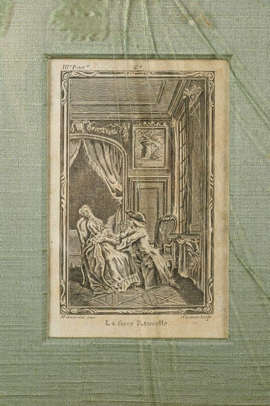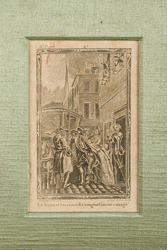of which: "La force paternelle" engr. Jacques Aliamet (1726-1788) (glass break); "Inoculation de l'amour" engr. N. Leinive; "La honte et les remords vengent l'amour outragé" engr. Augustin De Saint-Aubin (1736-1807). The prints are taken from the illustrations for "La Nouvelle Héloise" by J.J. Rousseau