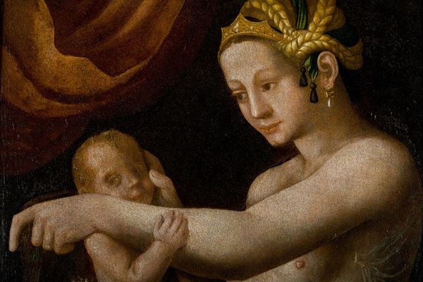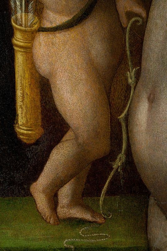 The work is presented in a discreet conservative state. An analysis with Wood's Lamp reveals scattered repaintings on the background and on the body of Venus and that of Cupid.