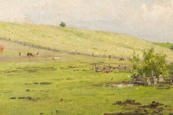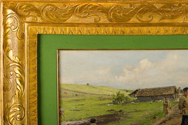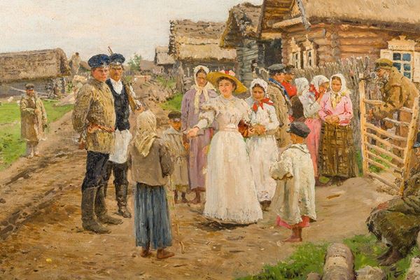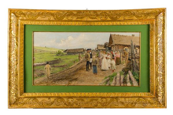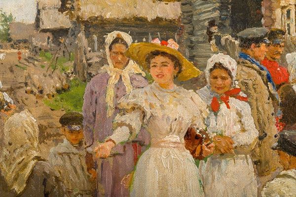 Similarities can be found with the painting entitled "Young ladies out for a walk among the cow" dated 1896 and now preserved at the Kiev National Museum of Russian Art.