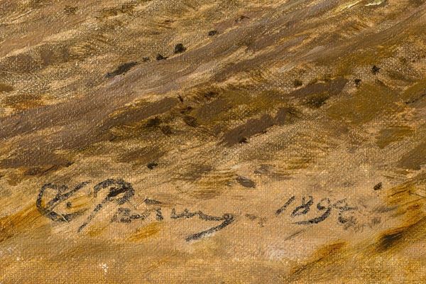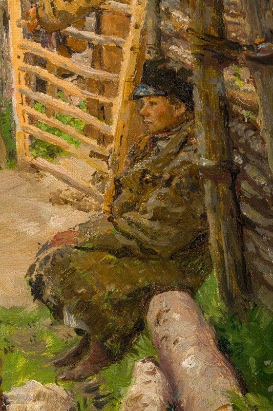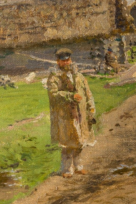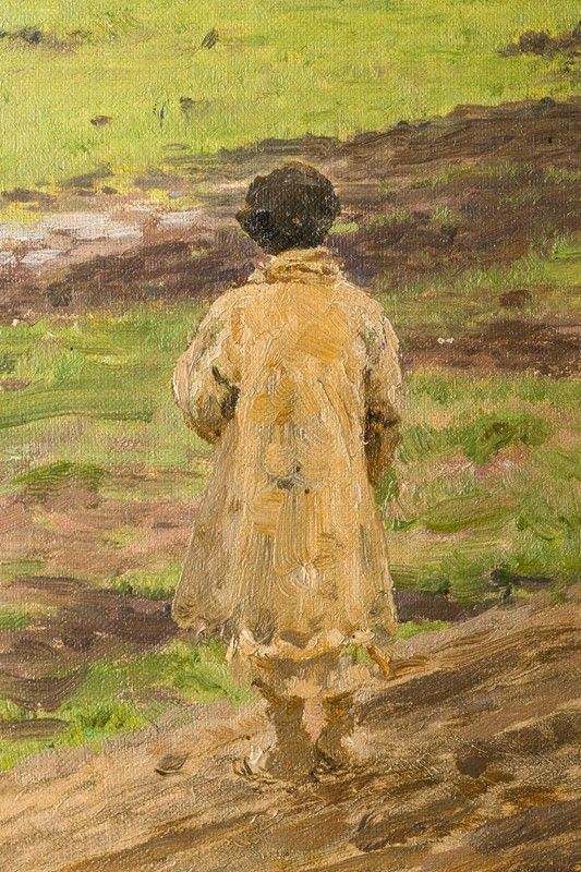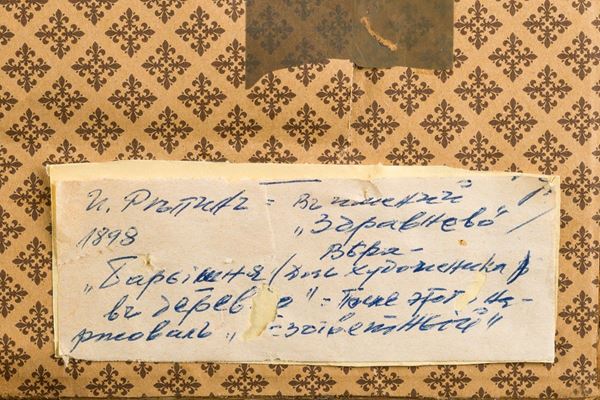 The canvas, which was purchased by the singer around the '70s of the twentieth century (document of which no documentation is preserved), bears a label on the reverse with the transcription of what, most likely, it could be found on the back of the canvas, now superimposed on a plywood board. Written in the characters of the Cyrillic alphabet in use before the Revolution, it seems to indicate the place where Repin would have painted the picture (in the country manor "Zdravneno", near Vitebsk, purchased by the painter in 1892) and the title of the work, which should represent the Master's daughter in the countryside.