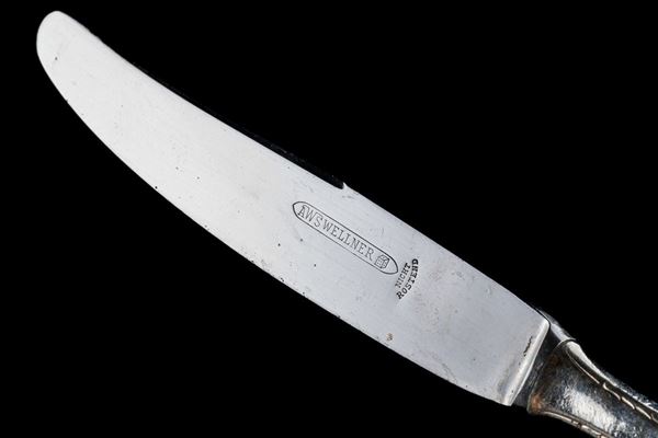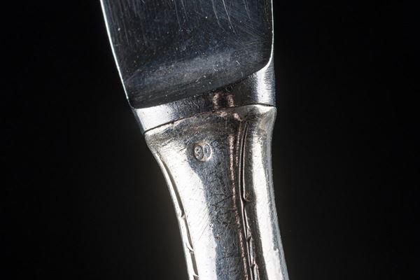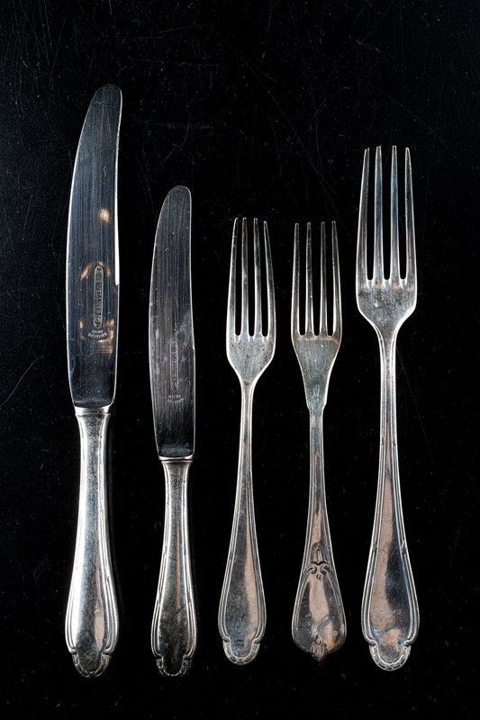 Non-complete set, consisting of: 6 fruit forks with tribulated arch handle, 3 fruit forks with bent arched handle, 9 large forks with tribulated arch handle, 9 large knives with tribulated arch handle and 9 fruit knives with tribulated bow handle. Weight 890 gr. Knives weight: 1240 gr. gross. Total weight: 2130 gr gross.