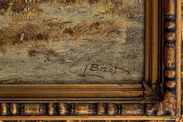 The painting with the female figure shows color drops in the upper left. Signed L. Bizot on the lower right. Framed.