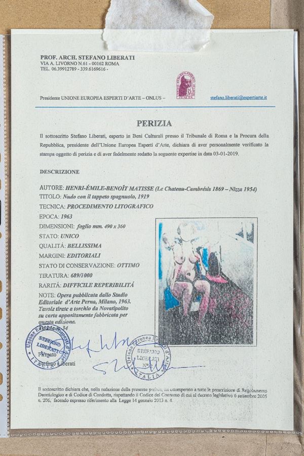 Circulation: 689/1000. Work published by the Perna Art Publishing Studio, Milan, 1963. Press-pressed tables by Novatipolito on paper specially manufactured for this edition. Table 34. Framed. On the back there is the report signed by Professor Stefano Liberati.