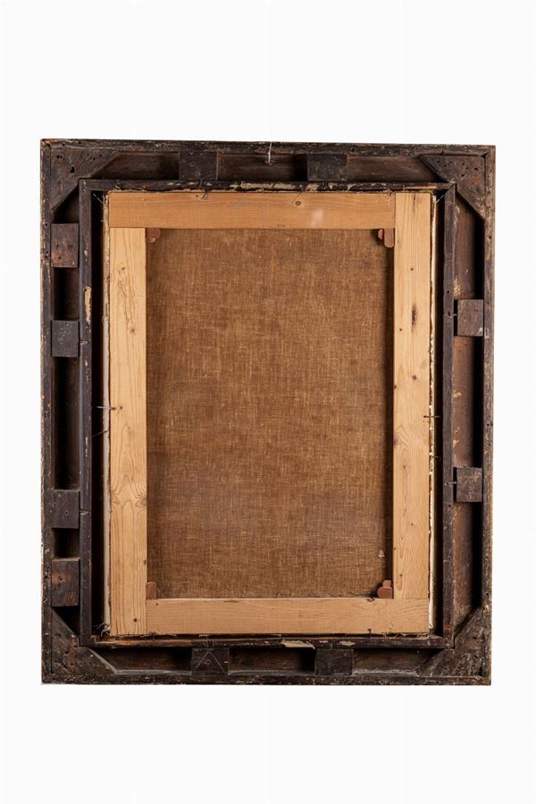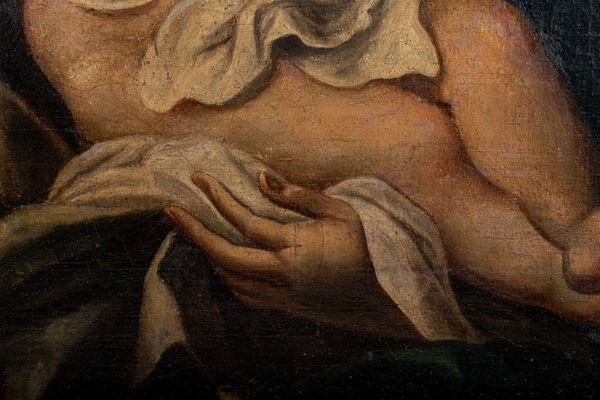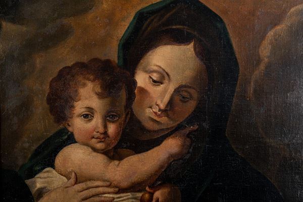 The painting, stylistically similar to the Madonnas painted by Pierre Mignard at the end of the 17th century, has several repaintings scattered on the pictorial surface. In particular, color highlights can be seen on the right side of the Madonna's mantle, on the arch of the eyebrows and on the lip. On the Child there are small touches of repainting on the right eye. The work is relined and framed.