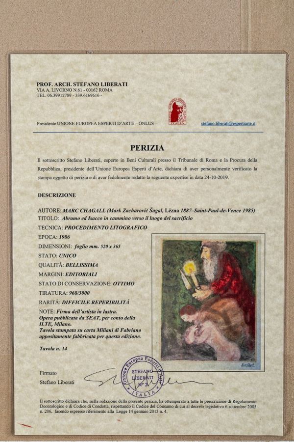 Circulation: 968/3000. Artist's signature on the plate. Work published by SEAT, on behalf of ILTE, Milan. Plate printed on Miliani di Fabriano paper specially manufactured for this edition. Table 14. Framed. On the back there is the report signed by Professor Stefano Liberati
