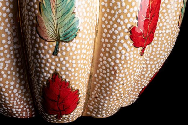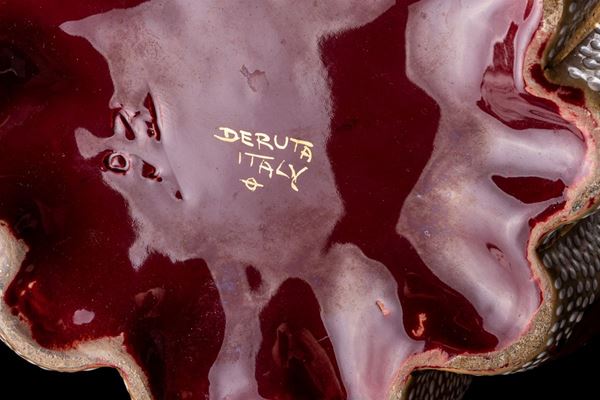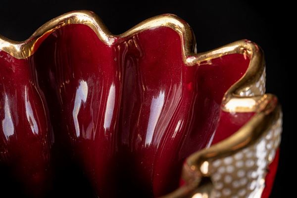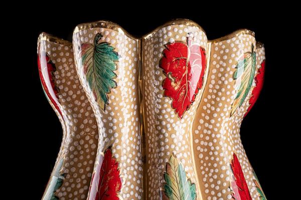 bud shaped, pink enamel with red and green leaves decoration and white enamel dots. Red interior. Deruta, based on a project by Gabriele Bicchioni. Signature engraved and printed under the base