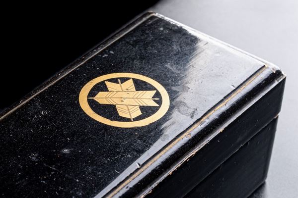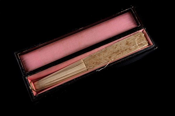 in embroidered silk and bone, inside original lacquered wood case. Different gores on the fabric