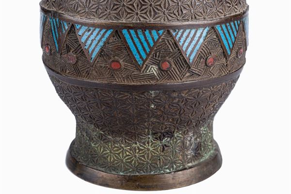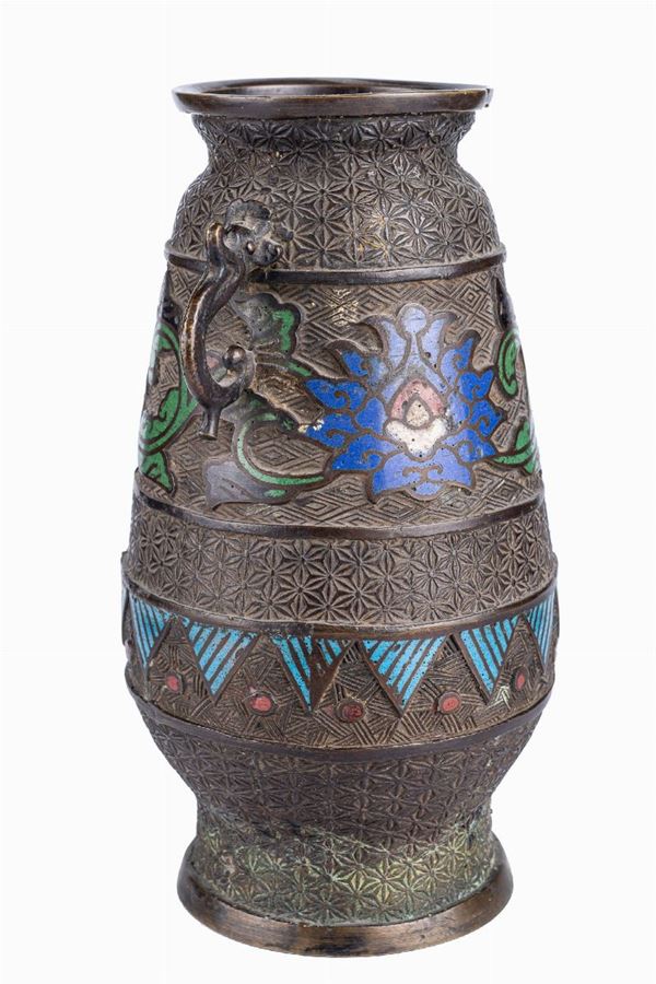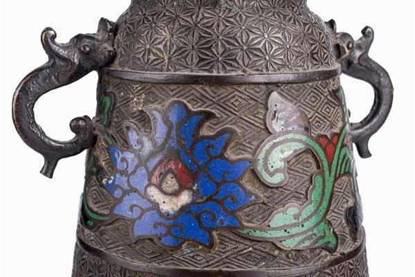 with cloisonné enamel decoration. Bruised and broken parts. Stamp at the base of one of the vases