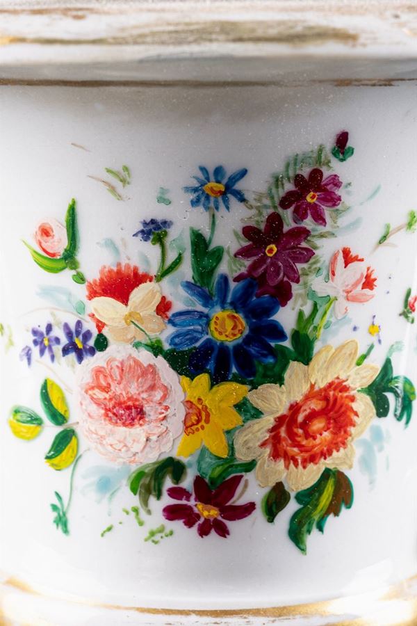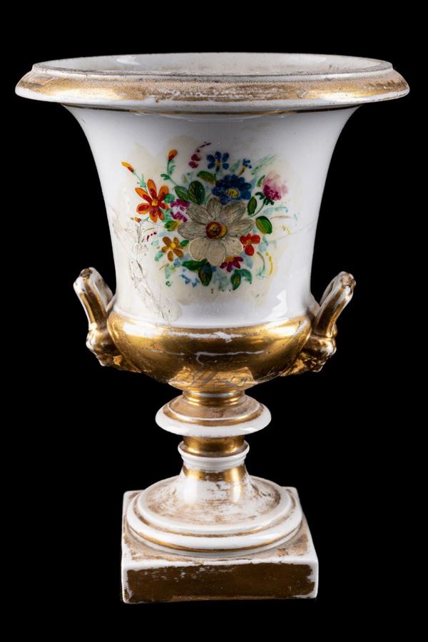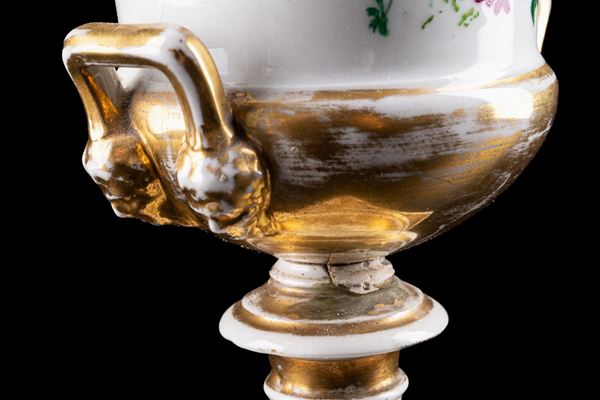 with floral decoration and gold finishes. Rectangular handles. One of the two reconstituted vases, small chips and partially consumed gold