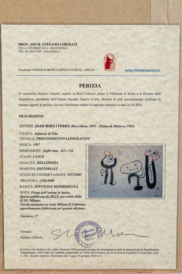 Artist's signature on the plate. Work published by SEAT, on behalf of ILTE, Milan. Plate printed on Miliani di Fabriano paper specially manufactured for this edition. Table n. 27. Framed. On the back it presents the report of Professor Stefano Liberati.