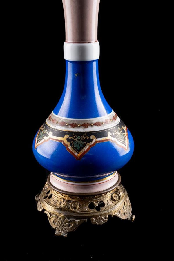 in blue opal glass, with geometric and floral decorations. Bronze cranksets, with boule