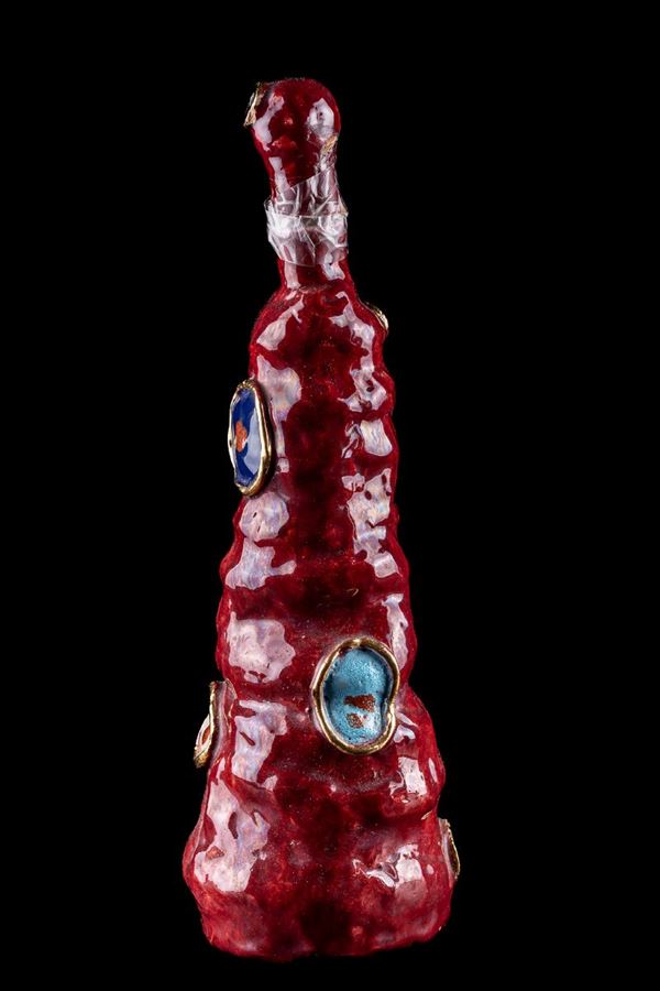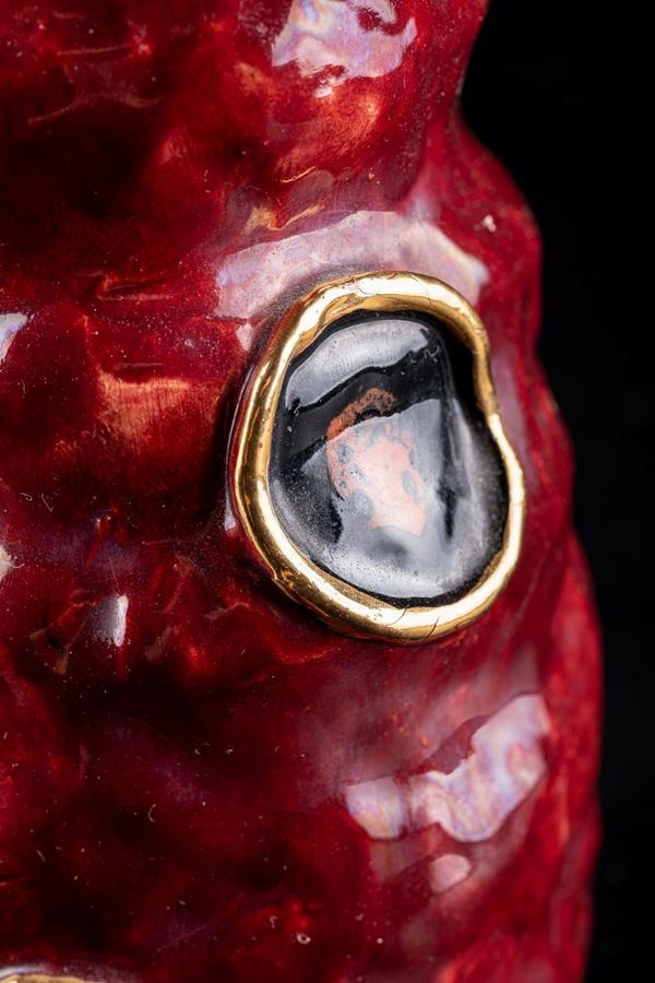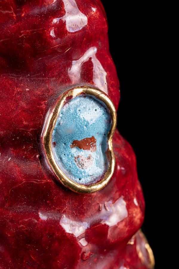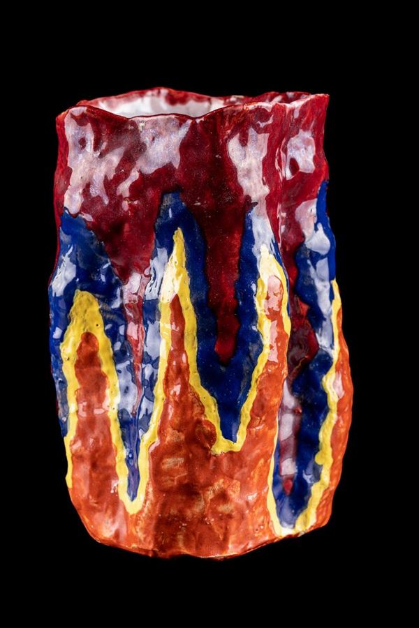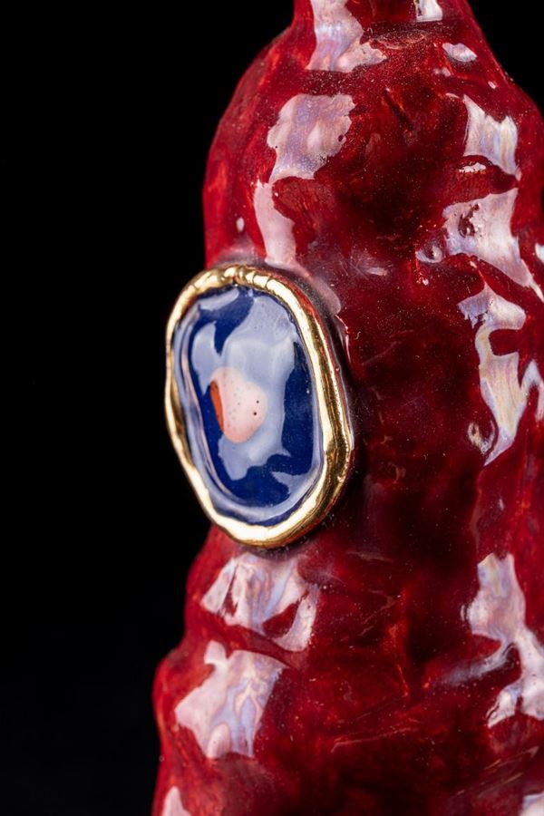 in red ceramic with yellow, orange and blue shades. Signed Montanari under the base. Several chips. Dimensions: 19 x 10 cm and 32 x 9 cm approximately