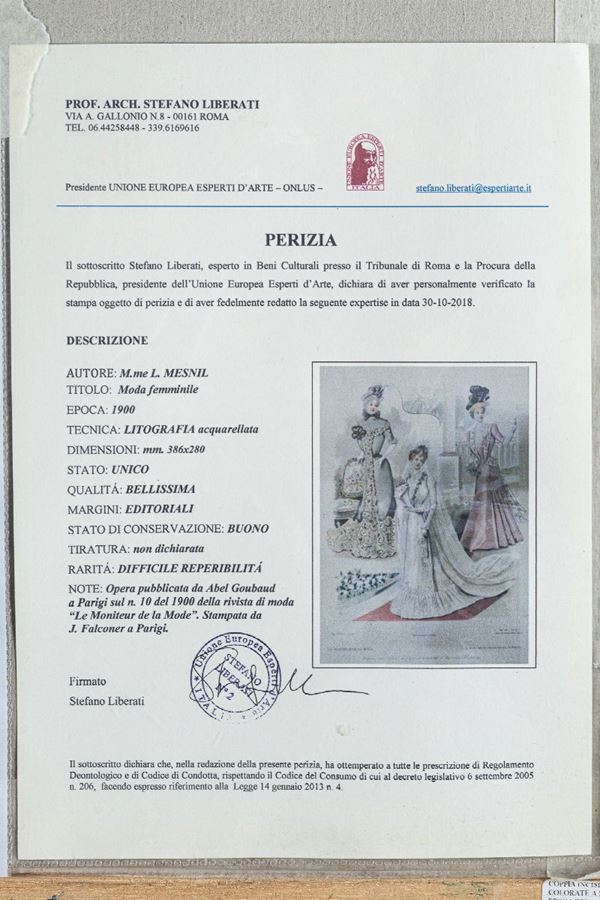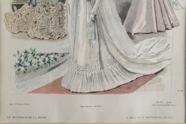 Work published by Abel Goubaud in Paris on n. 10 of 1900 of the fashion magazine "Le Moniteur de la Mode". Printed by J. Falconer in Paris. Framed, on the reverse there is the report signed by Professor Stefano Liberati.