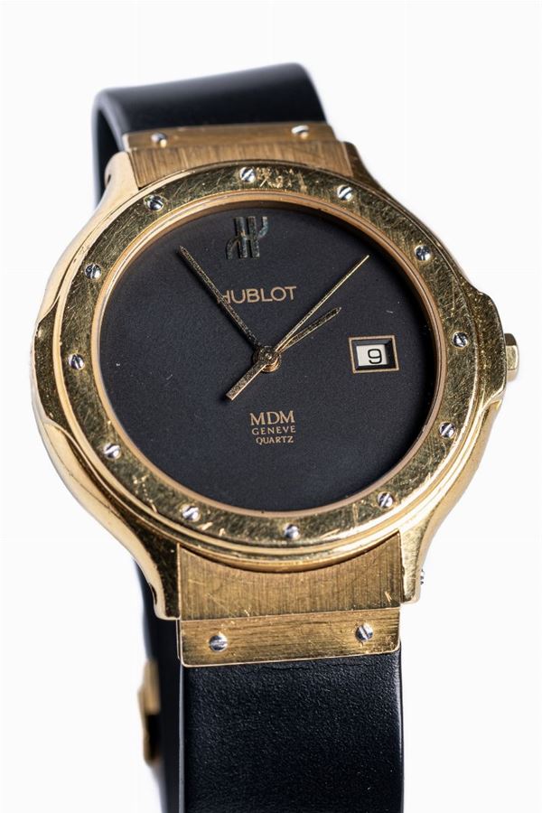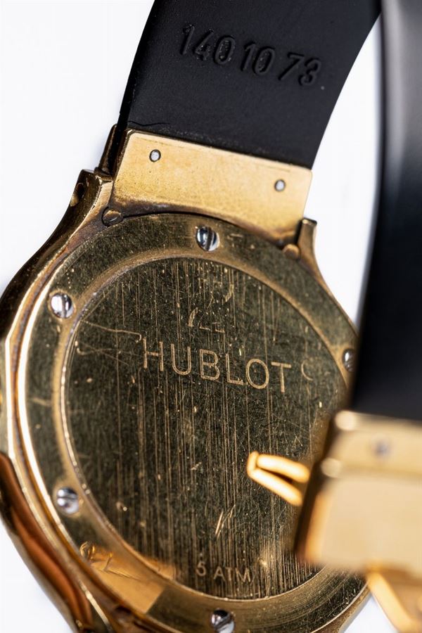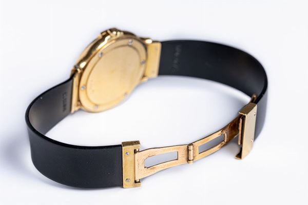 quartz movement, 33 mm diameter case, in working order. Original gold folding clasp, rubber strap. Defects as found.