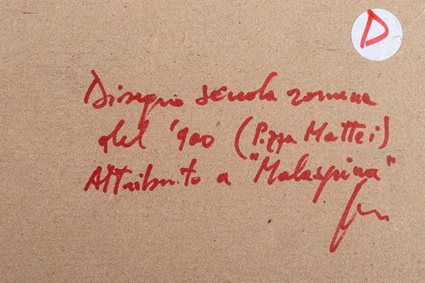 On the back the wording Roman school drawing of the twentieth century (Piazza Mattei) attributed to "Malaspina" is written. Presence of gores in the upper part of the drawing. Framed.