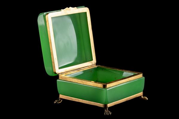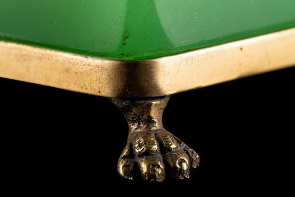 in green glass paste, with gilt bronze finishes, with four feline support feet