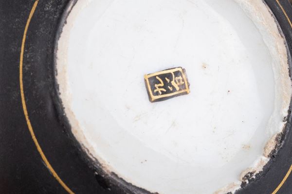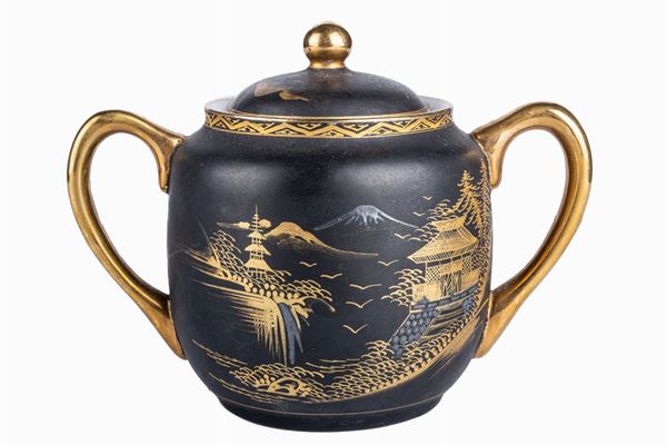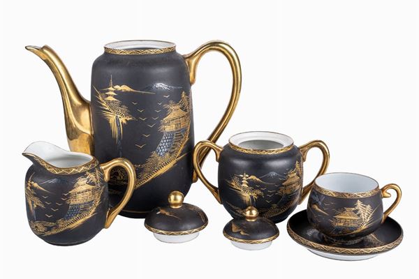 in black porcelain, with landscape decoration with Mount Fuji in gold, consisting of coffee pot, milk jug, sugar bowl, 6 saucers and 6 cups. Brand at the base. Coffee pot height: 18 cm, cup with saucer height: 5 cm
