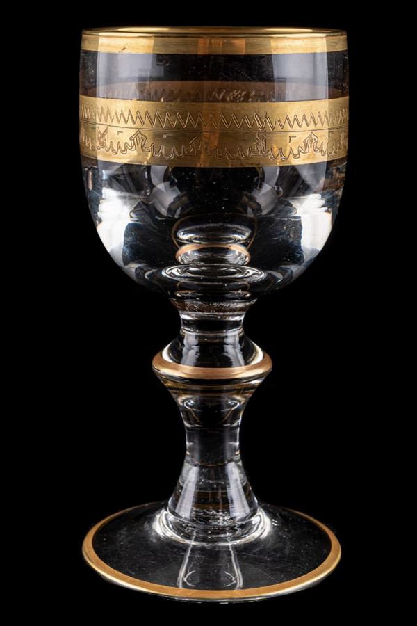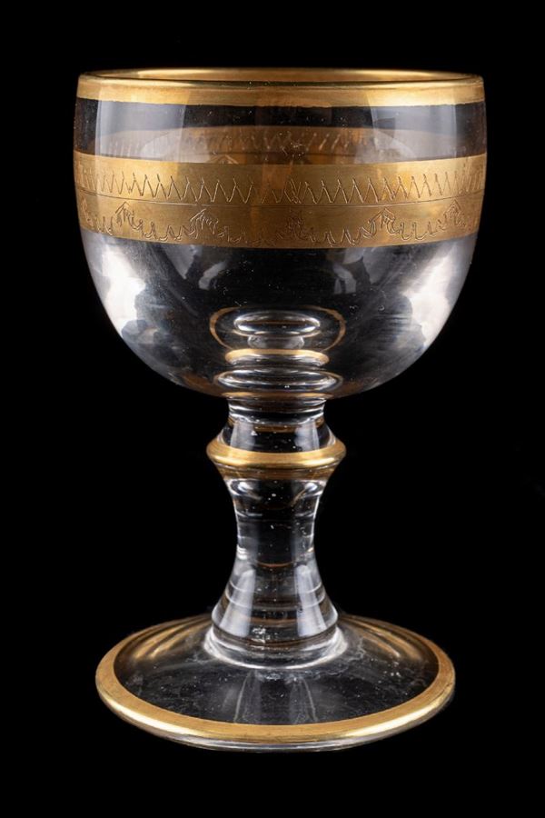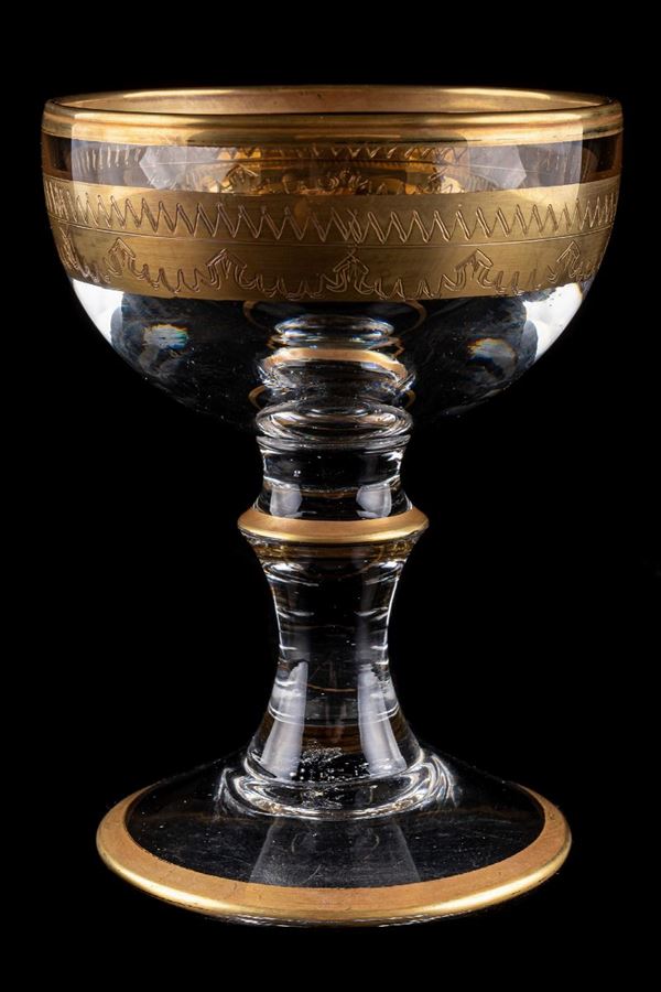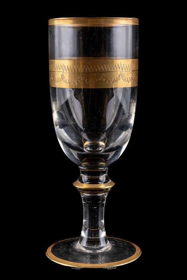 in glass, with golden decorations, consisting of: 20 white wine glasses, 21 water glasses, 21 goblets and 21 red wine glasses.