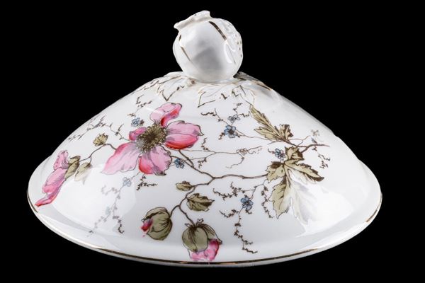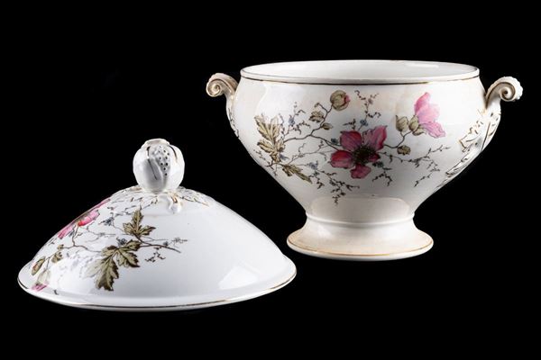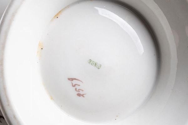 in white porcelain with pink floral decoration and golden edge. Consisting of: 10 dinner plates, 12 soup plates, 5 fruit plates, 1 salad bowl, 1 serving tray, 1 gravy boat, 1 small appetizer tray, 1 soup plate and 1 dinner plate, 1 tureen, 1 backsplash. Presence of some chipping. Ginori brand at the base.