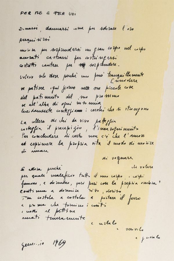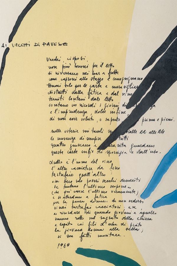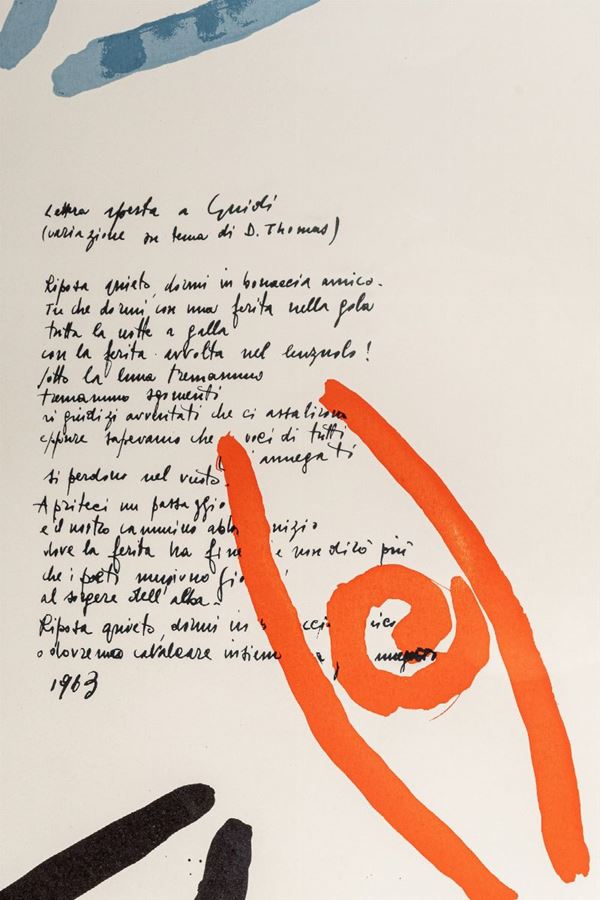 3 lithographs with drawings and transcriptions of poems. "Ai Vecchi di Pavese", edition number 31/50. "Lettera aperta a Guidi", edition number 31/50. "Per me e per te", edition number 31/50. The lithographs are signed and numbered by hand by the Master and have the "Karat" embossed stamp. Framed.
