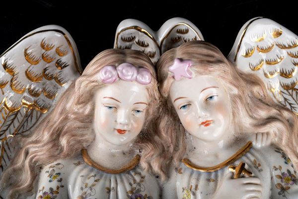Sculpture in shape, in polychrome porcelain, in the guise of a pair of angels holding up a shell-shaped basin. With pure gold finishes.