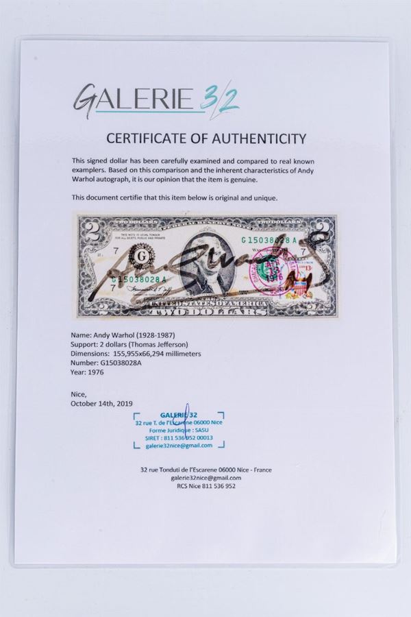 The two dollar bill (serial number G 15038028 A) has the author's signature on the front with black marker, postage stamp and postmark dated 13 April 1976.