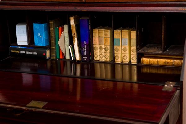 in mahogany and mahogany feather, consisting of two bodies: base with 3 drawers with calatoia and internal compartments, raised with 2 glass doors, with wooden frame and 3 shelves. Raised with broken gable, squared sides and front, shelf legs.