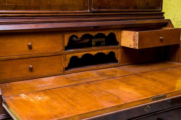 Double body mahogany wood. Base with three drawers, support feet with knob and calatoia with 4 drawers and 2 compartments, plus secret compartment with 3 drawers. Square front and sides. Upper part with two mirrored glass doors, with a door inside, 9 compartments and a shelf. Inside the door, 3 other shelves. Finishing with arched frame, square front and sides. Base and riser with geometric squares in fruit wood.