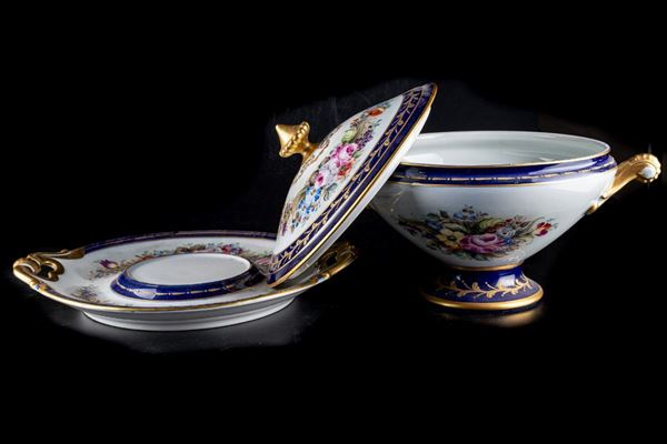 made up of tureen and tray, in white porcelain with floral decoration with borders in cobalt blue and pure gold. Plate: 36 cm diameter; tureen: 25 x 35 cm.