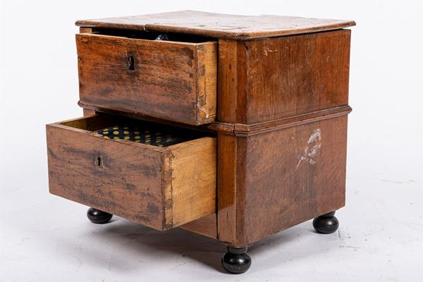 with two drawers. Square forehead and hips, onion-shaped feet. Missing parts, split top.